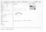 "A fragment ca. 3.5 cm. long of the top section of a large lunate earring. The body of the original piece was obviously composed of gold foil shaped around a paste filling. Marks of the hammering of the gold foil are visible. This fragment has the top ends of the crescent abruptly narrowed into wire, the pointed ends of which could be inserted into the pierced earlobe and crossed over each other, and finally affixed by twists."