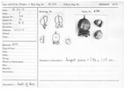 "More ornate than 698 with coiled ends placed on a solid piece of metal. A bar-like section is present with a central dot, one on each end. Pendants may have dangled from the bar, cf. 1585. Two fragments of hollow gold-foil balls accompany the find but their relationship to earring is not clear."