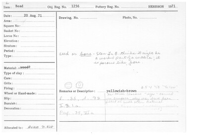 Material: ? Seed or bone. - Oystein LaBianca thinks it might be a worked part of a vertebra; it is porous like bone.