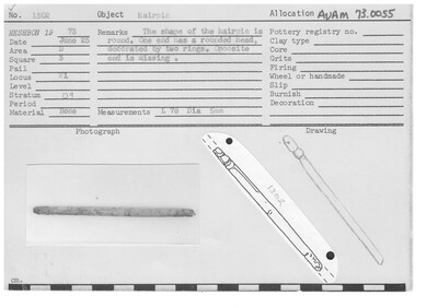 The shape of the hairpin is round. One end has a rounded head, decorated by two rings. Opposite end is missing.
