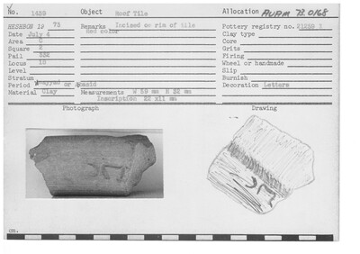 Incised on rim of tile. Red color.