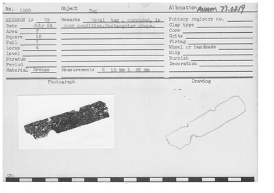 Metal tag, corroded, in poor condition. Rectangular shape.