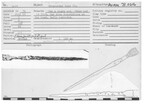 Has a sharp end, other end is flat. Has some decorations at the head. Badly corroded.