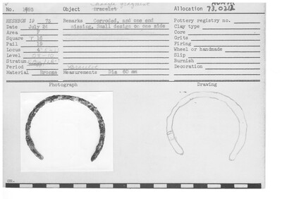"West grave contained thoroughly disturbed bones of 4 adults and 1 child, and an infant. One skull had vertical front suture as in T. 12 objects included jewelry, two whole glass vases, a Byzantine unguentarium, one Late Roman coin, and one (obj. No. 1529) of Honorius AD 395 - 423, early Byzantine. This legible coin and all the pottery indicated that the tomb was used in the Early Byzantine period and reused over a number of years."
