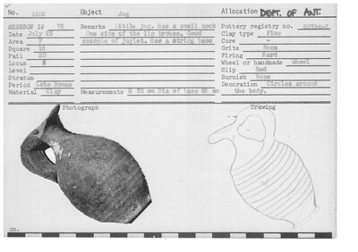 Little jug. Has a small neck. One side of the lip broken. Good example of juglet. Has a string base.