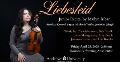 Mailyn Iribar presents her Junior Recital Liebesleid. Featuring works by Clara Schumann, Béla Bartók, Jessie Montgomery, Amy Beach, Johannes Brahms, and Fritz Kreisler.