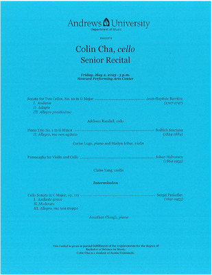 Colin Cha presents his Senior Recital featuring works by Barriere, Smetana, Handel-Halvorsen, and Prokofiev.
