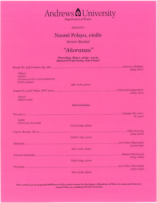 Naomi Pelayo presents her Senior Recital Añoranza. Featuring works by Brahms, J.S. Bach, Silvestrov, Sarasate, Wieniawski, and José Sabre Marroquín.