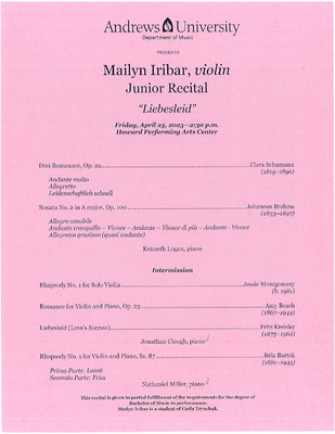 Mailyn Iribar presents her Junior Recital Liebesleid. Featuring works by Clara Schumann, Béla Bartók, Jessie Montgomery, Amy Beach, Johannes Brahms, and Fritz Kreisler.