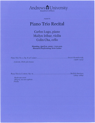 Pianist Carlos Lugo, Violinist Mailyn Iribar, and Cellist Colin Cha presents a Piano Trio Recital. Featuring works by Smetana, Shostakovich, and Piazzolla.