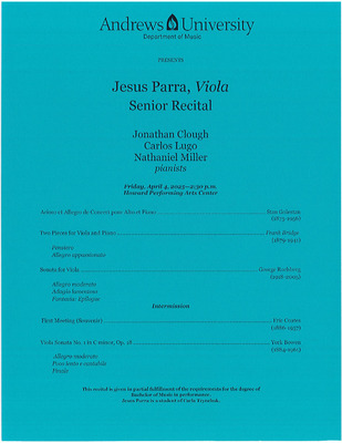 Jesús Parra presents his Senior Recital featuring works by Stan Golestan, Frank Bridge, George Rochberg, Eric Coates, and York Bowen.