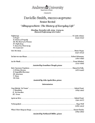 Davielle Smith presents her Senior Recital Alltagsgeschichte: The History of Everyday Life featuring works by H. Leslie Adams, Moses Hogan, Robert Schumann, Franz Schubert, Manuel de Falla, Gabriel Fauré, Hugo Wolf, and Ernest Charles.